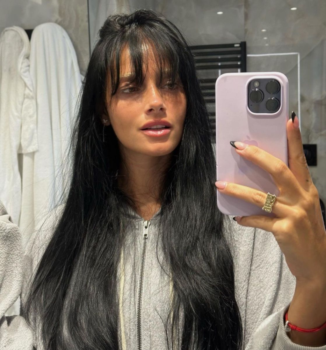 La hija de Catherine Fulop compartió dos selfies en el espejo del baño en las cuales mostró su nuevo flequillo y su clásico pelo largo negro, aún manteniendo sus cejas platinadas.