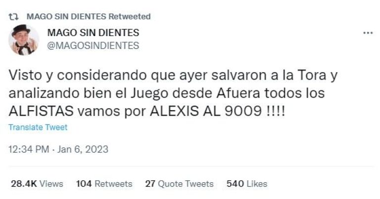 El Mago Sin Dientes, amigo íntimo de Alfa, sorprendió a todos al pedir que saquen a 'El Conejo'. Desde su cuenta de Twitter expresó: "Visto y considerando que ayer salvaron a La Tora, y analizando bien el Juego desde afuera, todos los ALFISTAS vamos por ALEXIS AL 9009".