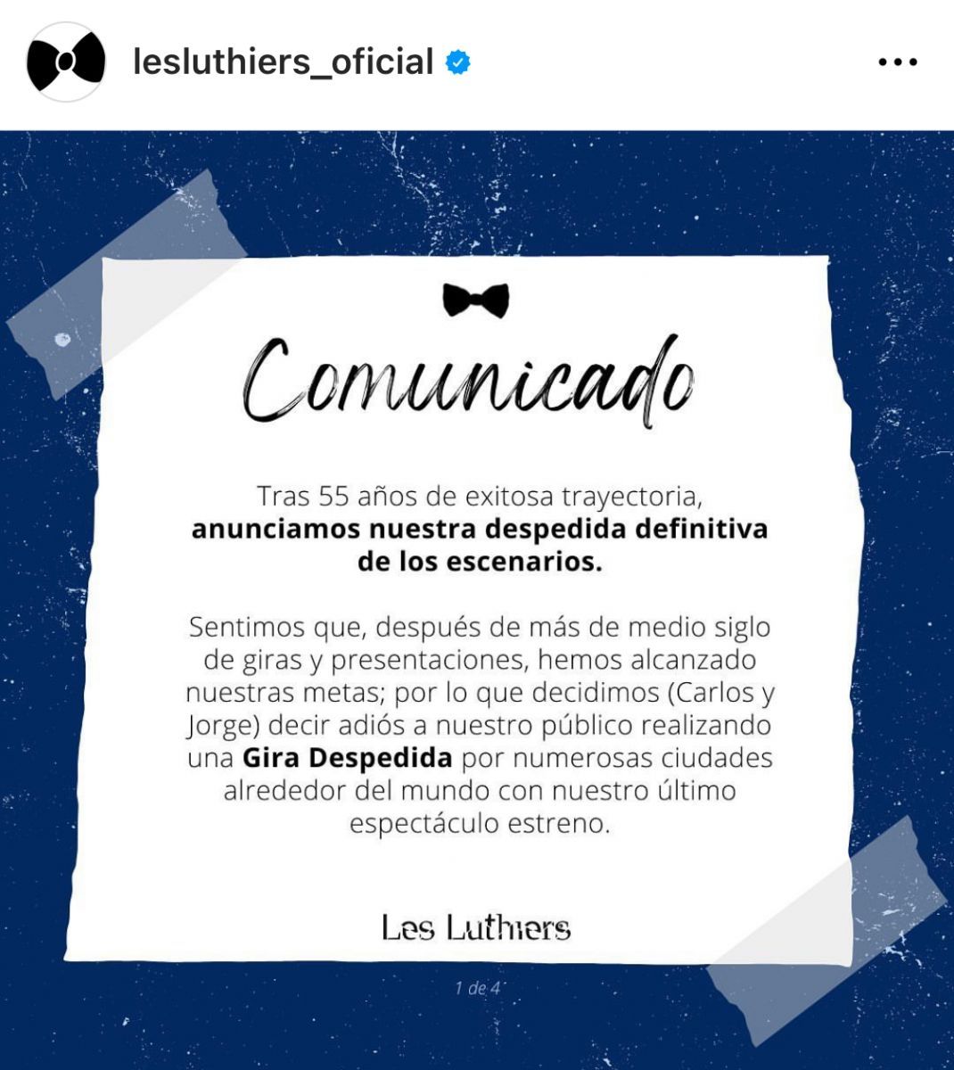 Luego de 55 años de una increíble trayectoria, el grupo musical-humorístico Les Luthiers comunicó su despedida de los escenarios a través de un posteo en su cuenta oficial de Instagram.