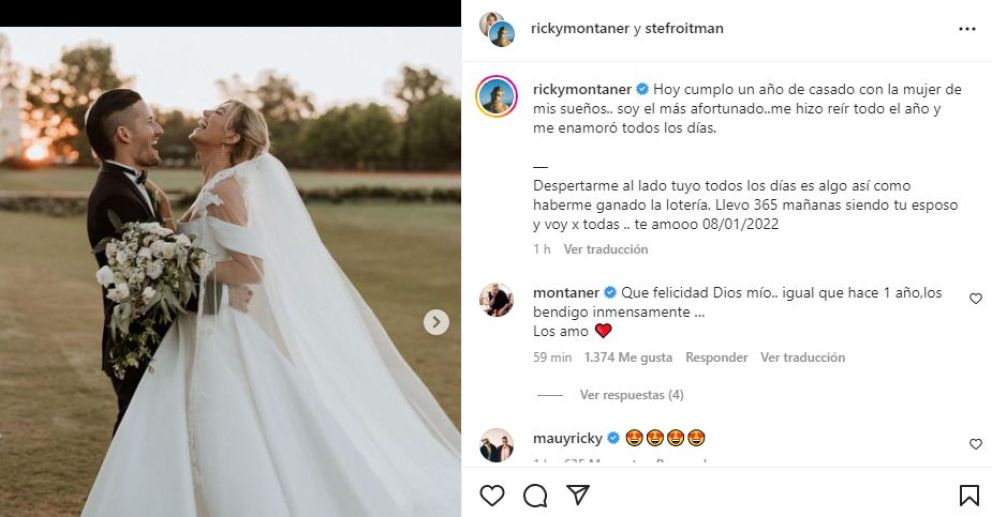 “Hoy cumplo un año de casado con la mujer de mis sueños. Soy el más afortunado. Me hizo reír todo el año y me enamoró todos los días”, escribió Ricky junto a distintas fotos de la pareja, entre ellas, una del dia de la gran boda.
