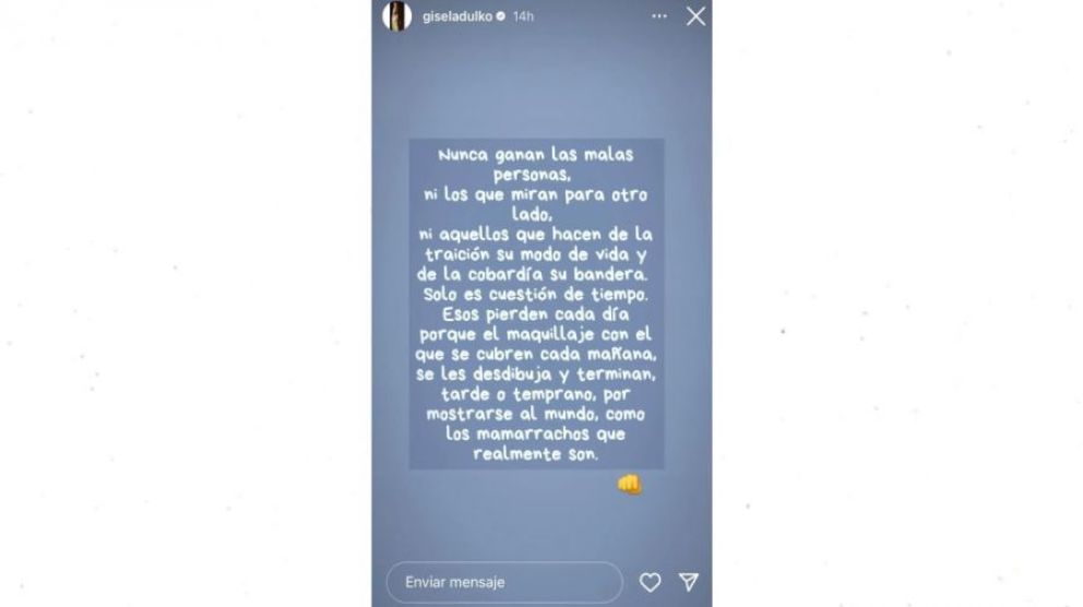 Por último, la publicación de Dulko indica: "Esos pierden cada día porque el maquillaje con el que se cubren cada mañana se les desdibuja y terminan, tarde o temprano, por mostrarse al mundo, como los mamarrachos que realmente son". Todo parece indicar que sería un palito para Gago ya que, a los minutos, Dulko se arrepintió y eliminó la historia.