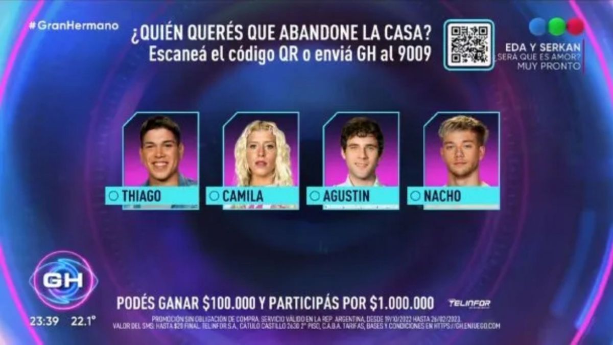 Al final, la nueva placa quedo conformada por: Thiago con 9 votos, que es la primera vez que puede abandonar la casa, Camila con la misma cantidad, Agustín y Nacho con 5 votos cada uno.