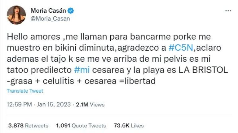 La diva con su lengua carateca, se expresó ante el apoyo de sus fans y de C5N: "Hello amores, me llaman para bancarme porque me muestro en bikini diminuta, agradezco a C5N, aclaro además que el tajo que se me ve arriba de mi pelvis es mi tatoo predilecto mi cesárea y la playa es LA BRISTOL".