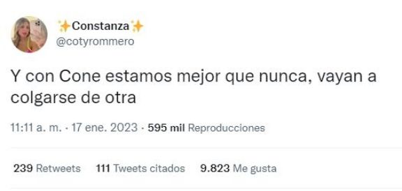 Desde su cuenta de Twitter, Romero muy picante lanzó: "Y con Cone estamos mejor que nunca, vayan a colgarse de otra", desmintiendo así cualquier crisis con Alexis.