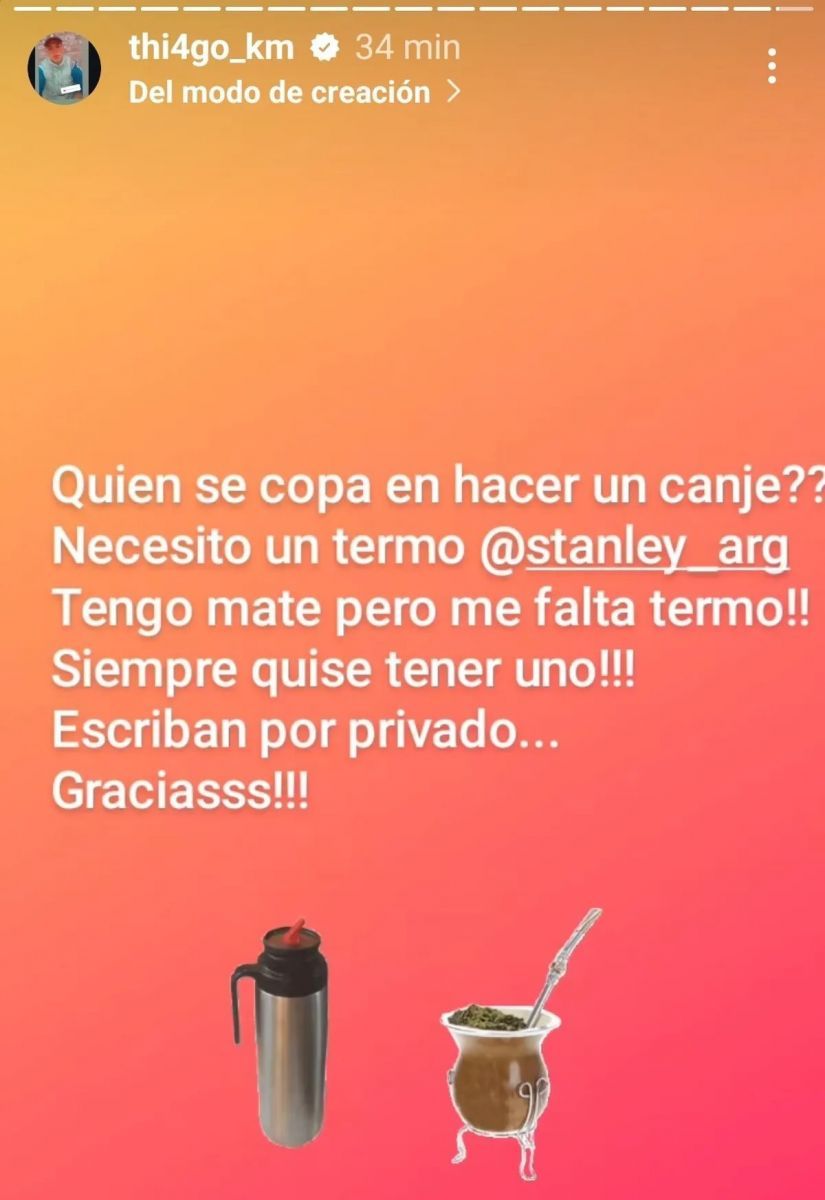 A poco de su salida del reality, el joven de La Matanza sorprendió a sus seguidores en Instagram con un curioso pedido. "¿Quién se copa en hacer un canje? Necesito un termo Stanley. Tengo mate, pero me falta termo! Siempre quise tener uno. Escriban por privado. Gracias", expresó.