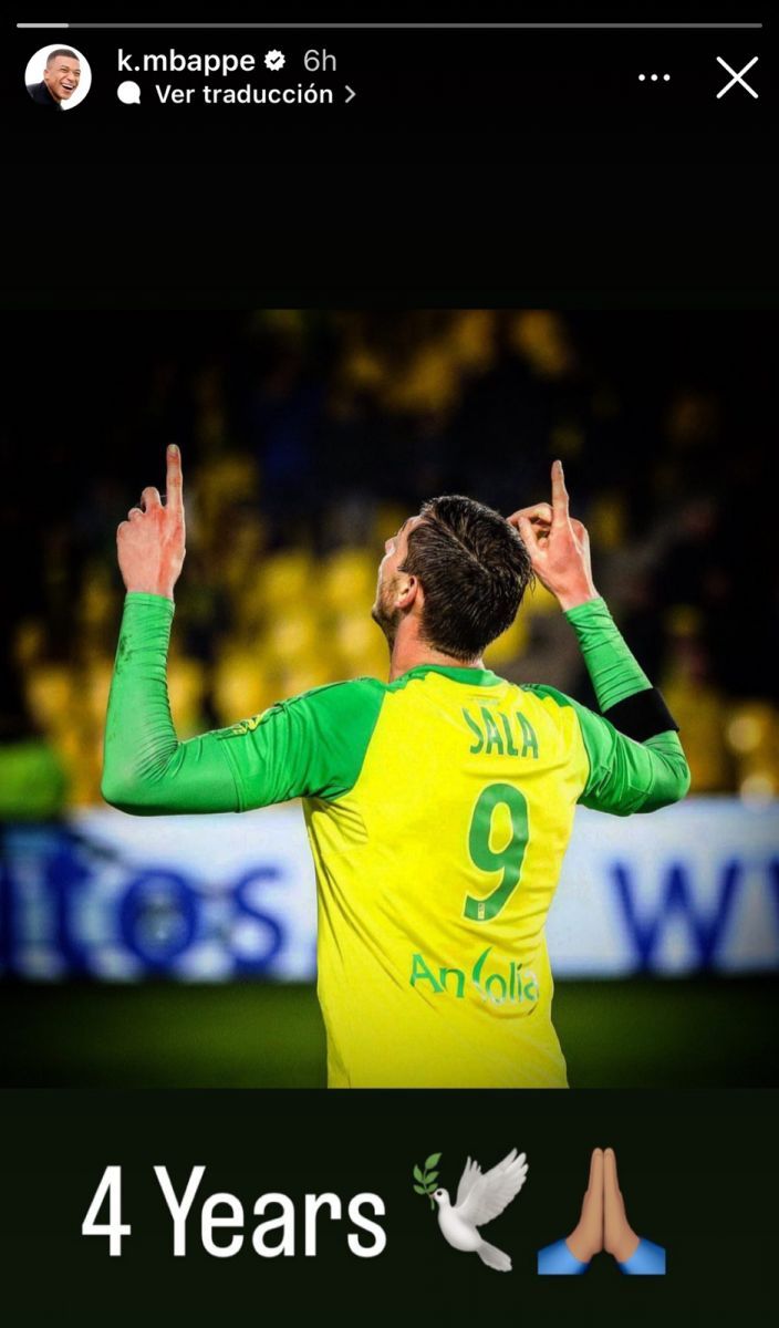 El futbolista francés, quien juegó con él en el Nantes y al ocurrir el accidente aportó dinero para la búsqueda del cuerpo, compartió en sus historias de Instagram una foto de Emiliano y escribió: “4 años”.
