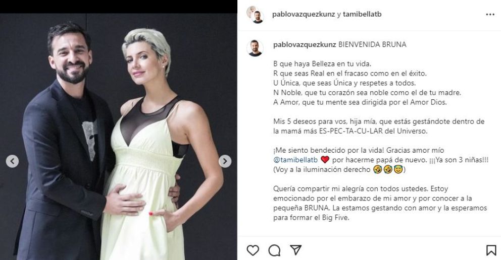 A pocos meses de haberse casado con el psicólogo Pablo Vázquez Kunz, la conductora Tamara Bella anunció a través de un emotivo posteo que ambos se encuentran a la espera de su primera hija.