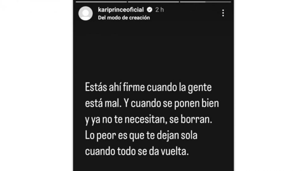 En su cuenta de Instagram, Karina expresó: "Estás ahí firme cuando la gente está mal. Y cuando se ponen bien y ya no te necesitan, se borran. Lo peor es que te dejan sola cuando todo se da vuelta".