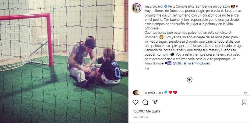 Así, junto a una dulce foto Icardi escribió: “Hoy ya sos un adolescente de 14 años pero para mí vas a seguir siendo ese chiquito que camina todo el día con una pelota en sus pies por toda la casa. Deseo que la vida te siga llenando de cosas buenas y que todas tus metas y sueños se puedan cumplir”.
