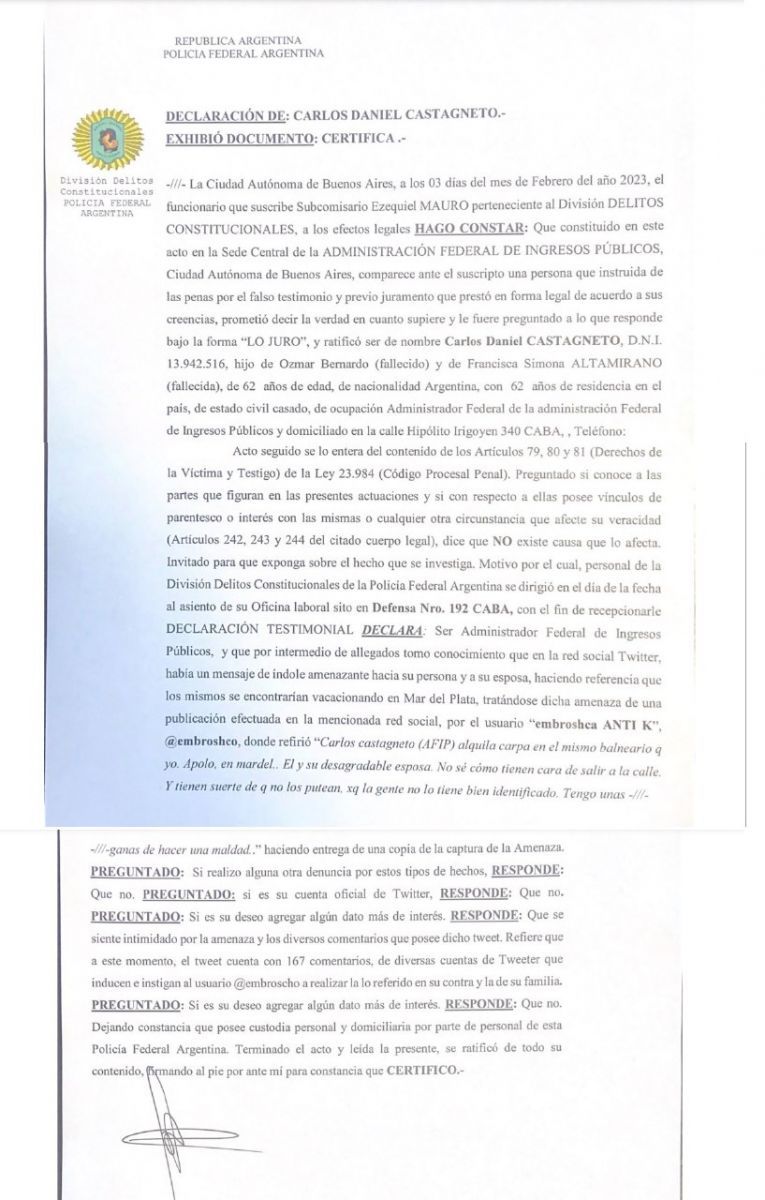 La Policia Federal le tomó declaración y ya interviene en la investigación.