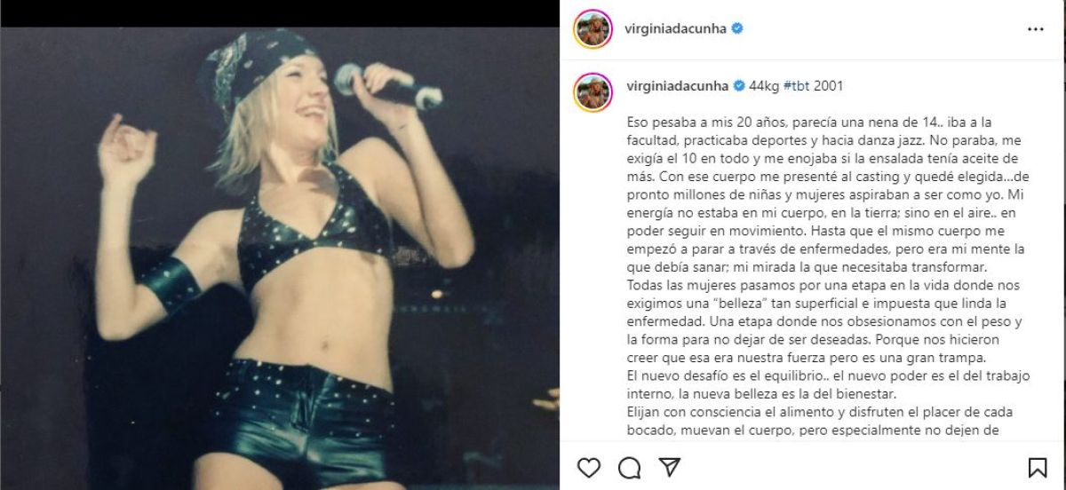 “44 kg pesaba a mis 20 años, parecía una nena de 14. Iba a la facultad, practicaba deportes y hacía danza jazz. No paraba, me exigía en todo y me enojaba si la ensalada tenía aceite de más. Con ese cuerpo me presenté al casting y quedé elegida”, sostuvo junto a una foto de esos años.