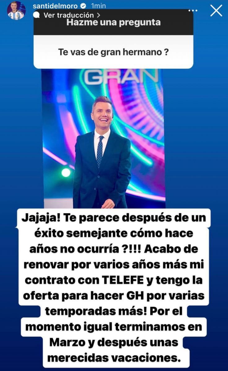 En los últimos días, estuvo circulando algunos rumores sobre la posible salida de Santiago del Moro de Gran Hermano. Lo cierto es que el conductor lo desmintió cuando dio la posibilidad que le hagan cualquier pregunta mediante las historias de Instagram, donde surgió la incognita que todos se preguntaban: "¿Te vas de Gran Hermano?", apuntó uno de sus seguidores.