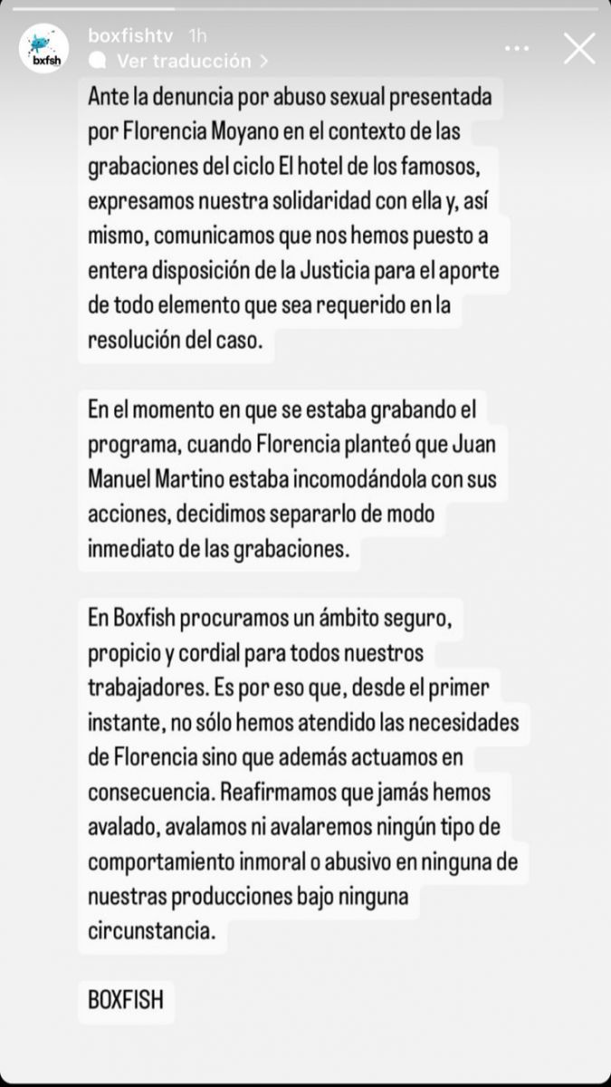 Luego de que trascendiera la presentación a la Justicia la denuncia de Flor Moyano a Juani Martino por abuso sexual con acceso carnal en El Hotel de los Famosos 2, la productora del reality BoxFishtv informó en Instagram la "solidaridad con ella y, así mismo comunicamos que hemos puesto a entera disposición de la Justicia para aporte de todo elemento que sea requerido en la resolución del caso".