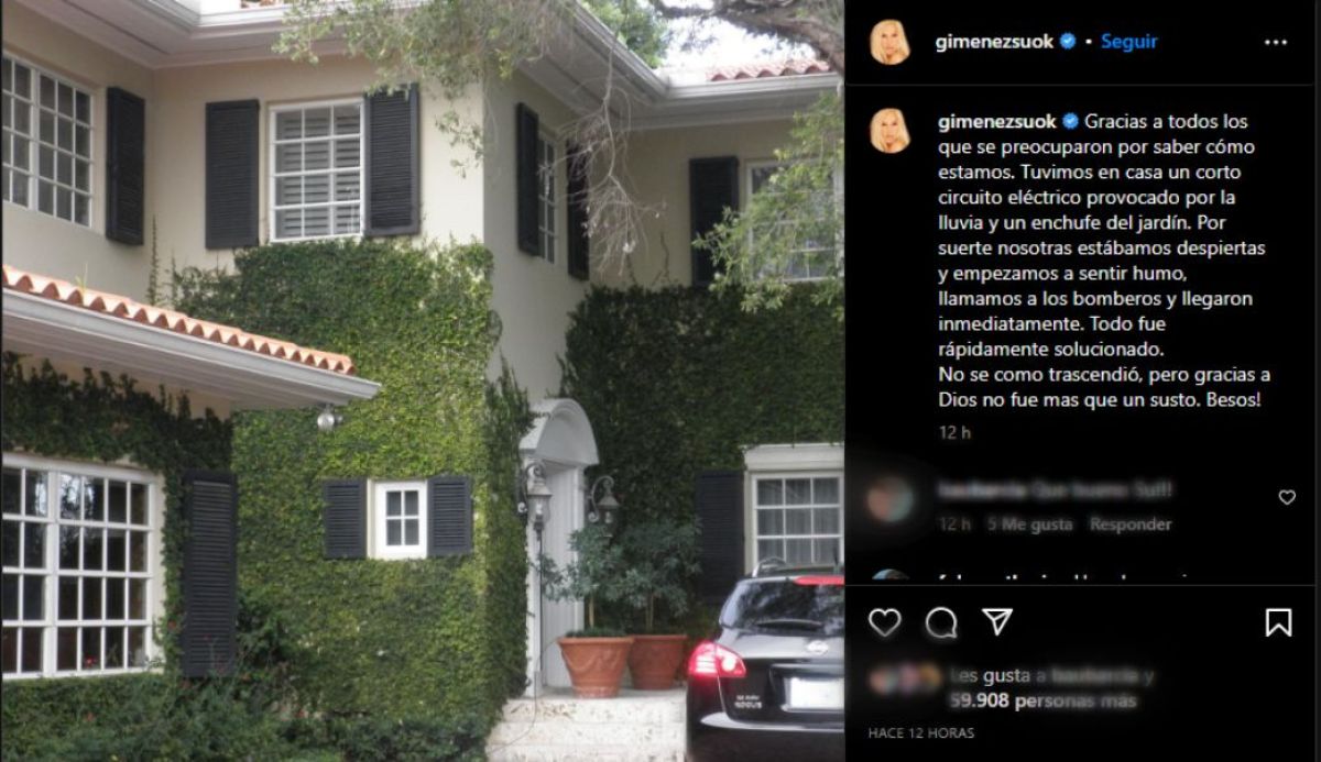 "Tuvimos en casa un corto circuito eléctrico provocado por la lluvia y un enchufe del jardín", relató Giménez. En el posteo incluyó una foto de su lujosa vivienda ubicada en la Venetian Island de la mencionada ciudad de los Estados Unidos.