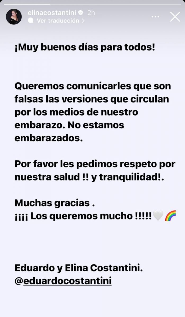 “Muy buenos días para todos. Queremos comunicarles que son falsas las versiones que circulan por los medios de nuestro embarazo. No estamos embarazados”, sostuvo.