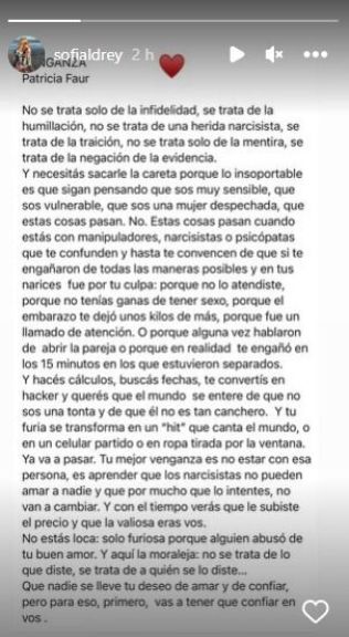 Con un posteo en Instagram, mostrando un escrito titulado "Venganza", que pertenece a la psicóloga Patricia Faur, Aldrey apuntó: "No se trata solo de la infidelidad, se trata de la humillación, no se trata de una herida narcisista, se trata de la traición. No se trata solo de la mentira, se trata de la negación de la evidencia".