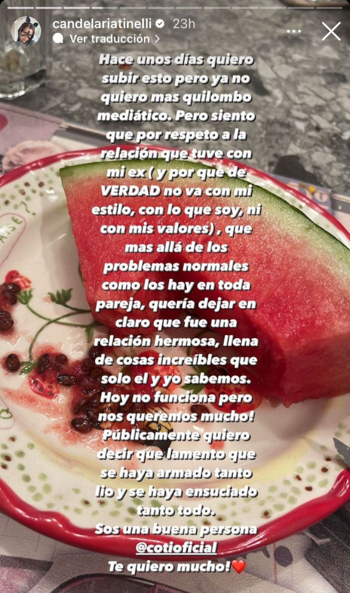 Si bien Cande Tinelli habló en su momento acerca de infidelidades, en las últimas horas publicó un contundente mensaje en sus redes sociales acerca de lo que fue su relación con el cantante Coti Sorokin.