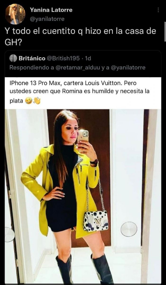 En su cuenta de Twitter, Yanina Latorre compartió una foto de Romina en donde se ve que está usando una cartera de lujo y un celular de alta gama, y por eso escribió: "¿Y todo el cuentito que hizo en la casa de Gran Hermano 2022?".