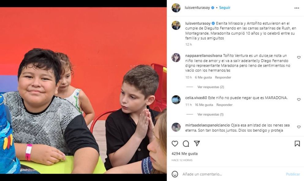 En el cumple resaltó la presencia de Antoñito, el hijo menor de Luis Ventura y Fabiana Liuzzi, que formó parte del divertido encuentro. “Helenita Mirasola y mi hijo estuvieron en el cumple de Dieguito Fernando en las camas saltarinas. Maradonita cumplió diez años y lo celebró entre familia y amiguitos”, escribió el periodista, que formó parte de la celebración del hijo del legendario futbolista.