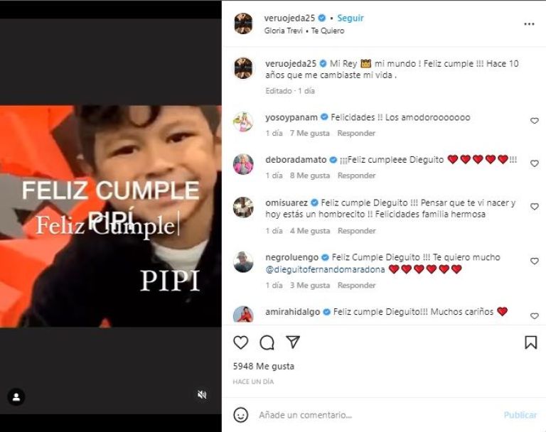 "Mi rey, mi mundo ¡Feliz cumple!” Hace diez años que me cambiaste mi vida”, le dedicó Verónica Ojeda, que eligió un reconocido lugar de camas elásticas en Pilar para el festejo. La productora de televisión y radio Patricia Mirasola, publicó: "Cumpleaños de Dieguito. La pasamos muy bien. Gracias por la invitación Vero y Mario Baudry".