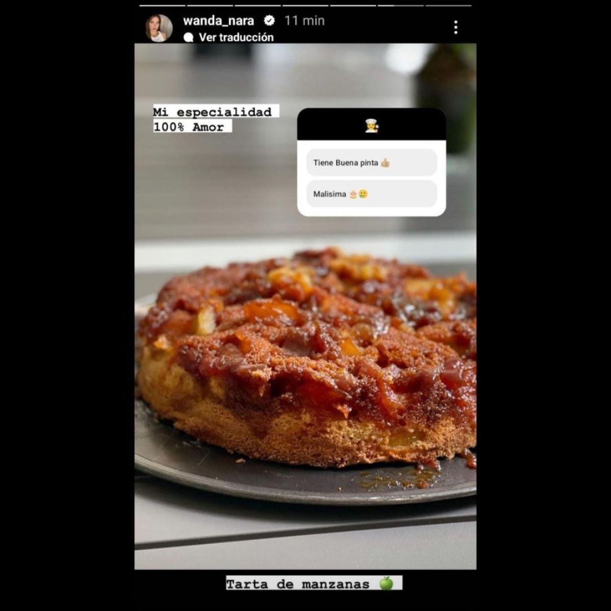 "Tarta de manzanas. Mi especialidad, 100% amor", escribió encima de una foto que le tomó al pastel. Y también dejó una encuesta, para que sus seguidores opinen sobre cómo le quedó. "Tiene buena pinta o malísima", fueron las opciones que dejó.