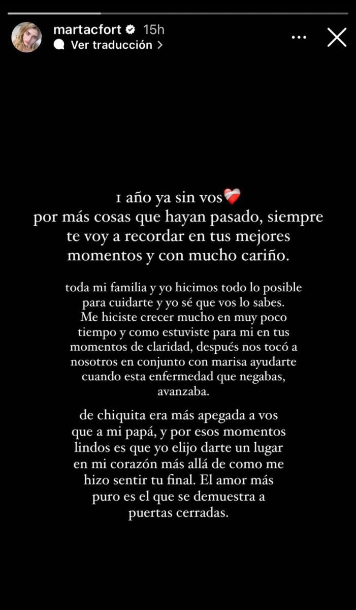 “De chiquita era más apegada a vos que a mi papá. Por esos momentos lindos es que yo elijo darte un lugar en mi corazón más allá de cómo me hizo sentir tu final. El amor más puro es el que se demuestra a puertas cerradas”, concluyó.