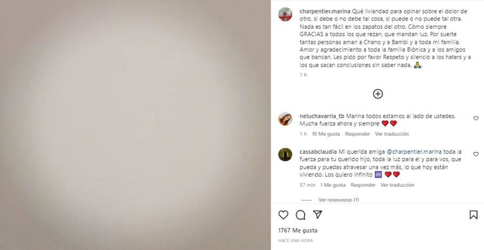 De este modo, no todo es malo y Marina no dejó de agradecer a quienes estan genuinamente interesados por el estado de Chano: "Como siempre GRACIAS a todos los que rezan, que mandan luz. Por suerte, tantas personas aman a Chano y a Bambi y a toda mi familia. Amor y agradecimiento a toda la familia Biónica y a los amigos que bancan. Les pido por favor respeto y silencio a los haters y a los que sacan conclusiones sin saber nada".