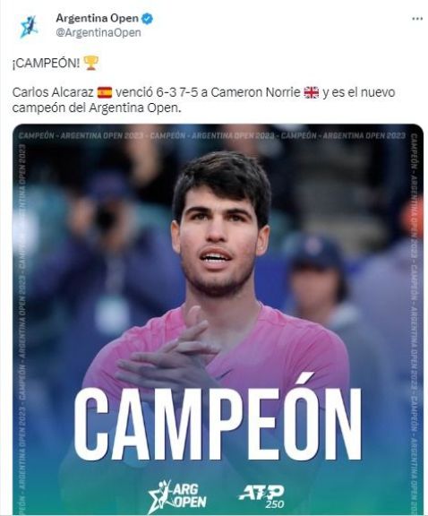 El tenista español Carlos Alcaraz se consagró campeón del Argentina Open tras imponerse en la final este domingo sobre el británico Cameron Norrie por 6-3 y 7-5 en la edición número 23.