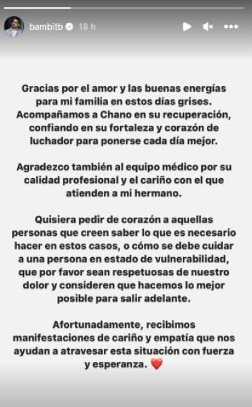 En sus stories de Instagram, Bambi expresó: “Gracias por el amor y las buenas energías par ami familia en estos días grises. Acompañamos a Chano en su recuperación, confiando en su fortaleza y corazón de luchador para ponerse cada día mejor. Agradezco también al equipo médico por su calidad profesional y el cariño con el que atienden a mi hermano”.