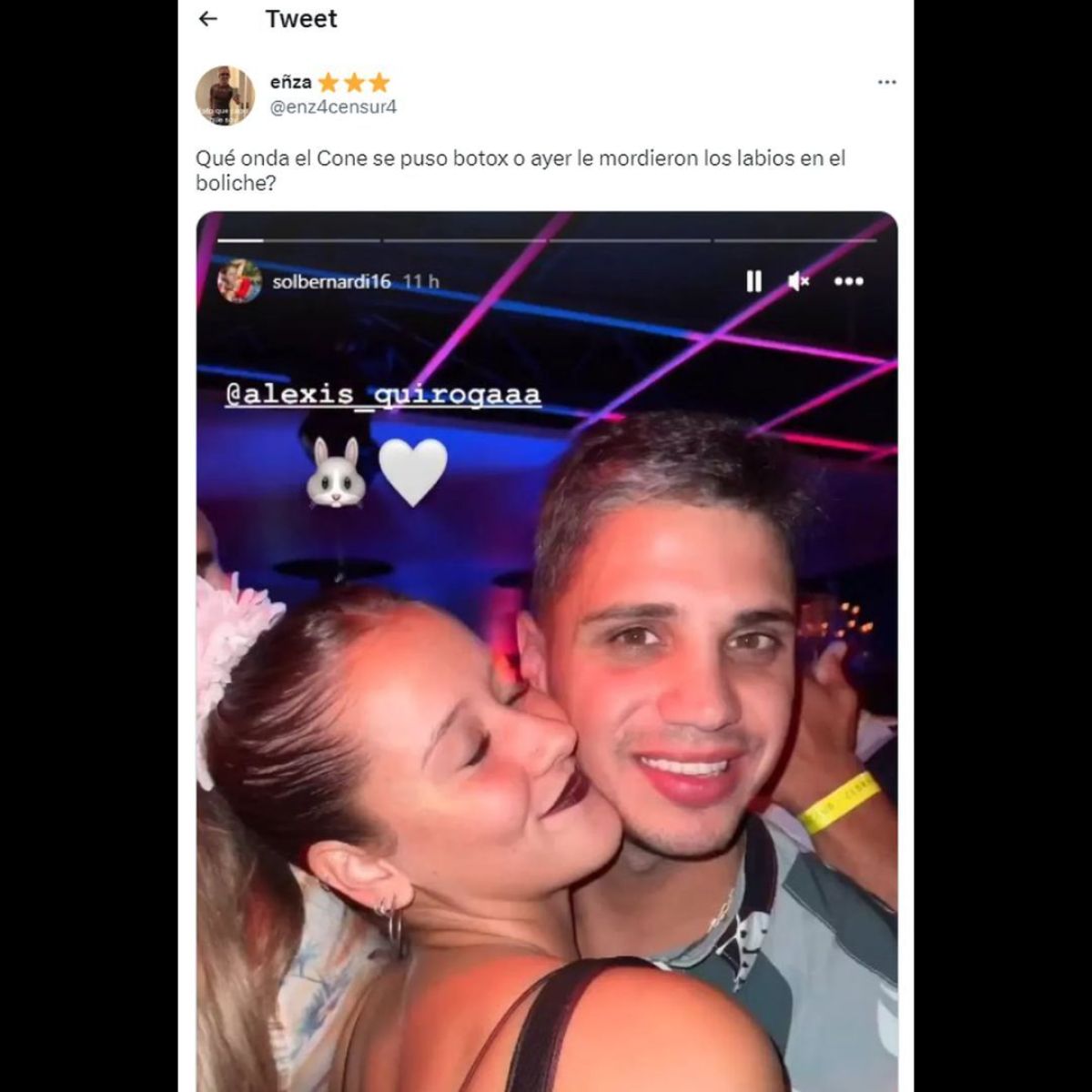 Aunque todo venía sobre rieles, hubo una situación que desató un escándalo en las redes. El Conejo fue a un boliche y se sacó una foto con una admiradora, que se puso muy cariñosa. La imagen en cuestión no tardó en viralizarse. Un usuario en Twitter subió la foto con un mensaje polémico: "¿Qué onda el Cone? ¿Se puso botox o ayer le mordieron los labios en el boliche?".