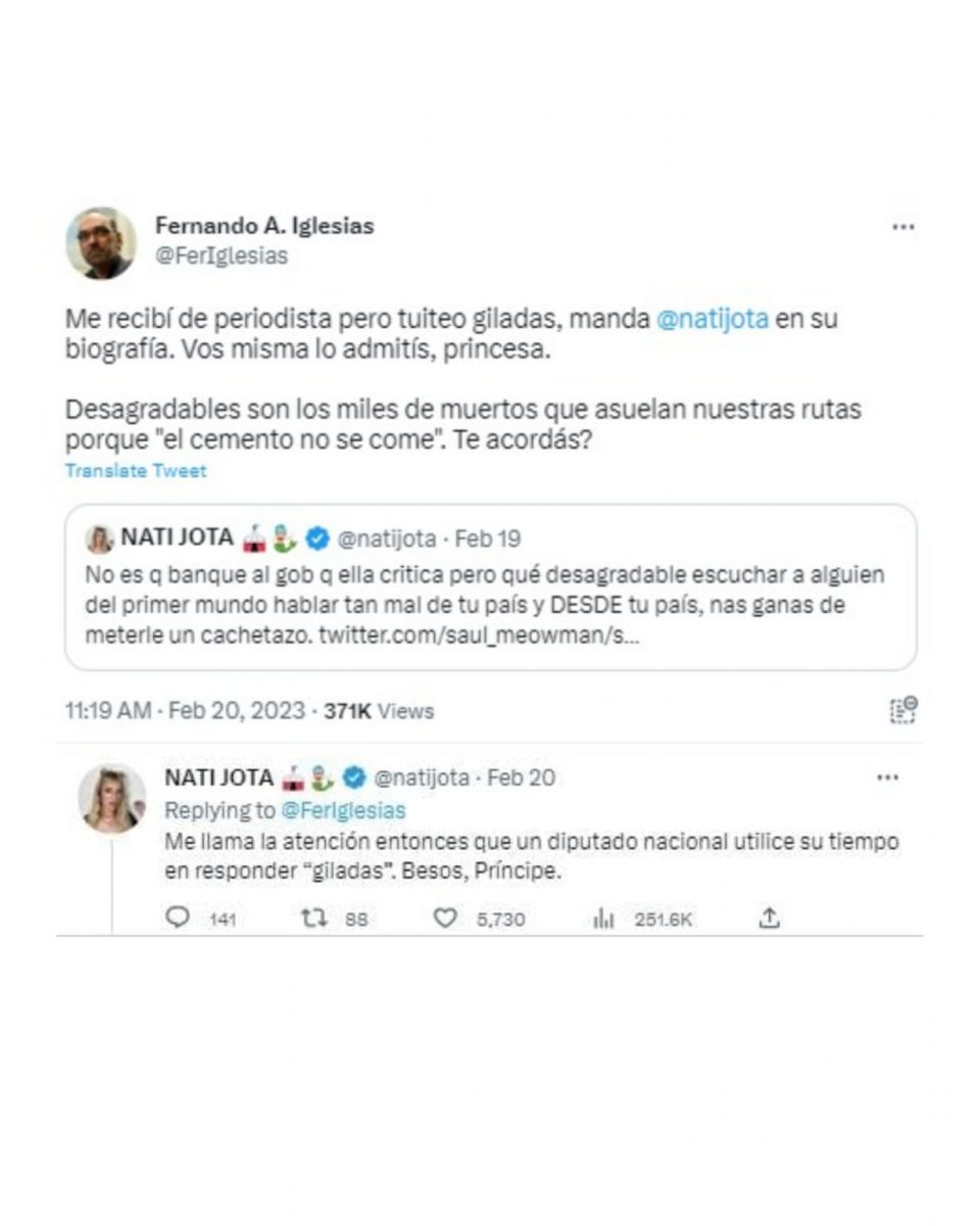 Ante esto, el funcionario salió al cruce para chicanearla: "Me recibí de periodista pero tuiteo giladas, manda 'natijota' en su biografía. Vos misma lo admitís, princesa". Y añadió:"Desagradables son los miles de muertos que asuelan nuestras rutas porque 'el cemento no se come'. Te acordás?".