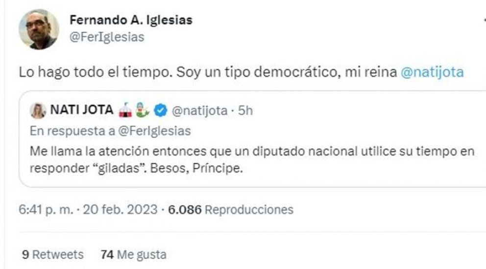 Lejos de achicarse, la periodista le respondió: "Me llama la atención entonces que un diputado nacional utilice su tiempo en responder 'giladas'. Besos, Príncipe". Y Fernando admitió tener tiempo de más y dijo: "Lo hago todo el tiempo. Soy un tipo democrático, mi reina".