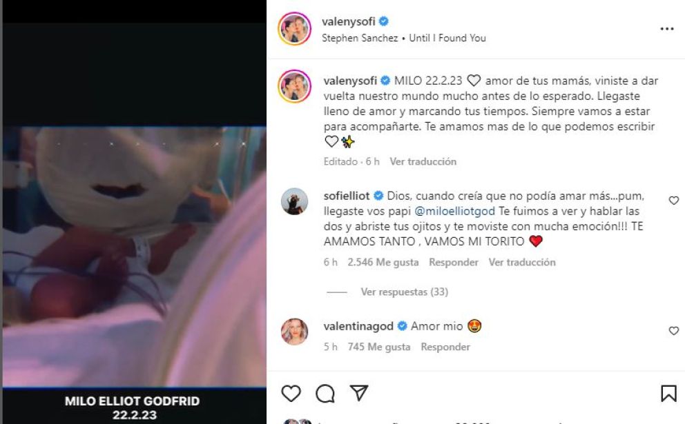 “Dios, cuando creía que no podía amar más...pum, llegaste vos papi @miloelliotgod Te fuimos a ver y hablar las dos y abriste tus ojitos y te moviste con mucha emoción!!! TE AMAMOS TANTO , VAMOS MI TORITO", comentó Sofi.