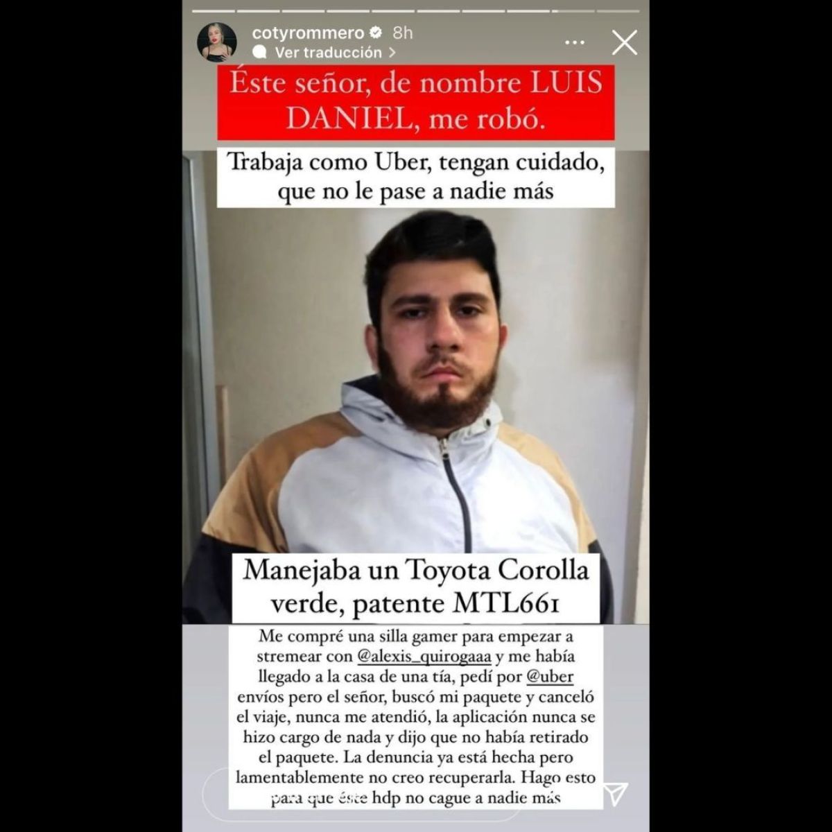 Coti Romero, la ex Gran Hermano 2022, denunció a través de sus redes que fue víctima de un hecho de inseguridad, luego de que un chofer de una conocida aplicación le robara.