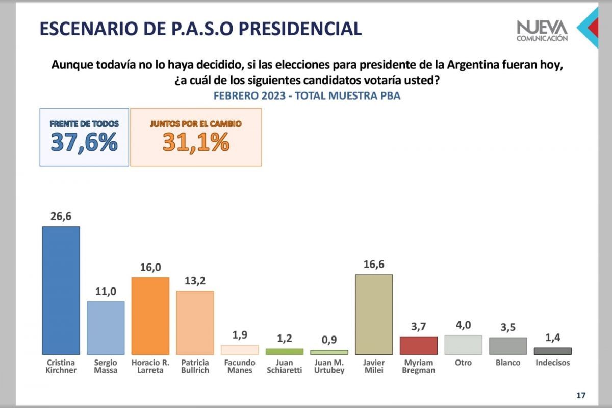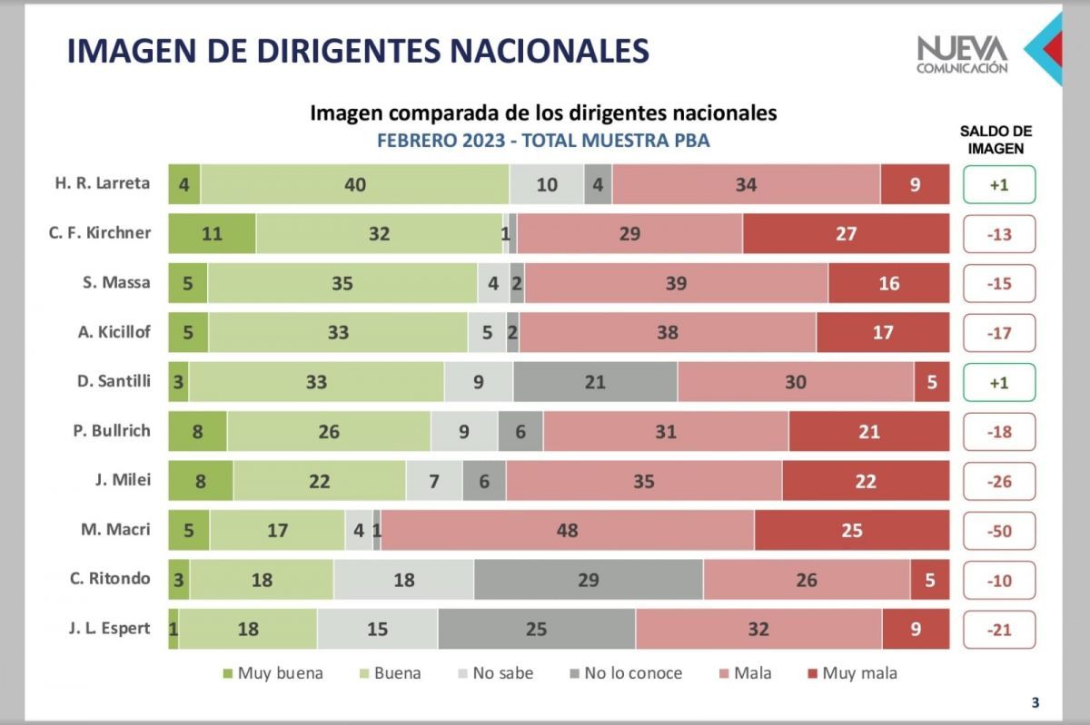 Dicho estudio se desarrolló en febrero de 2023 entre residentes de la Provincia de Buenos Aires y relevó que Rodríguez Larreta "es el dirigente nacional con mejor imagen positiva entre el electorado bonaerense: con 44% de imagen positiva, 43% de imagen negativa y un diferencial de +1".