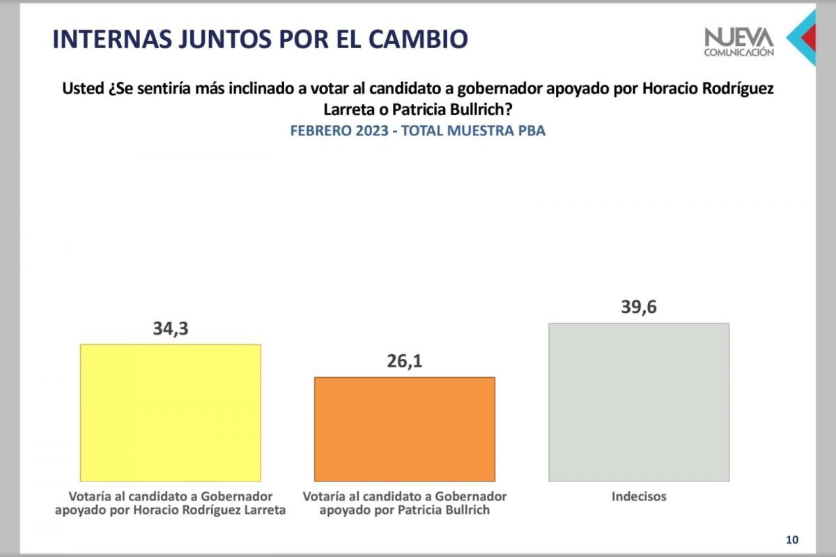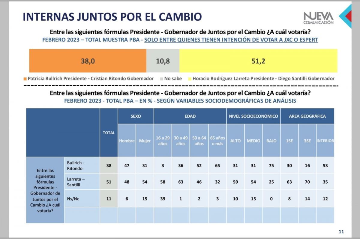 Respecto a la interna en Juntos por el Cambio (JxC) en el ámbito de la provincia de Buenos Aires, el 51,2% optó por Rodríguez Larreta para la Presidencia y por Diego Santilli para la gobernación bonaerense, mientras que el 38% dijo que votaría por Patricia Bullrich para Presidente y por Cristian Ritondo para la gobernación.