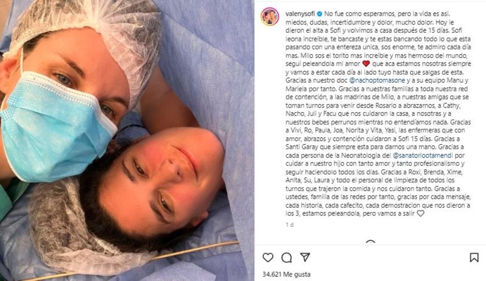 En ese sentido, Valentina se expresó en la cuenta que comparte junto a Sofía en Instagram. "No fue como esperamos, pero la vida es así. Miedos, dudas, incertidumbre y dolor, mucho dolor. Hoy le dieron el alta a Sofi y volvimos a casa después de 15 días", sostuvo.