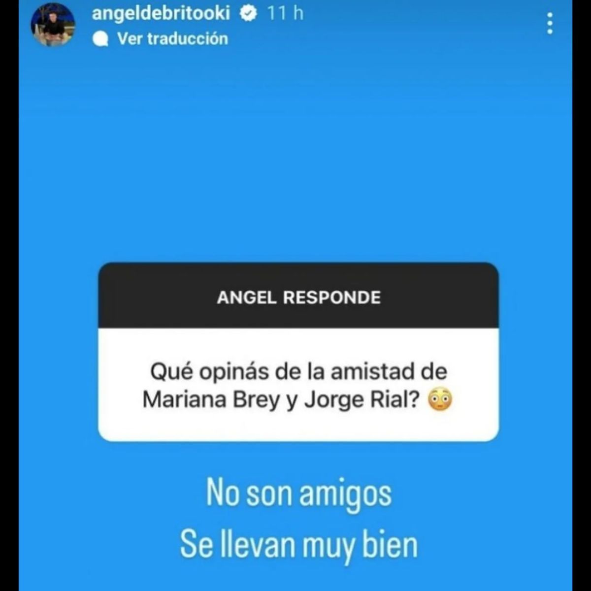 "¿Qué opinás de la amistad de Mariana Brey y Jorge Rial?", y sin dudarlo Ángel dejó ver que entre ellos hay algo más que compañerismo o una mera amistad. "No son amigos. Se llevan muy bien...", contestó el conductor.