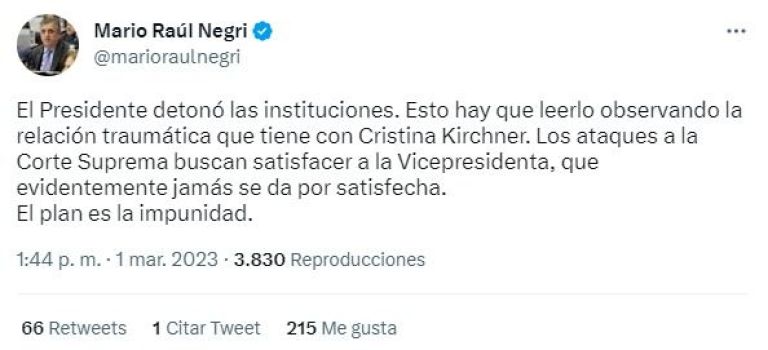 En cambio, el diputado nacional por Cordóba, Mario Negri expresó en su cuenta de Twitter: "El Presidente detonó las instituciones. Esto hay que leerlo observando la relación traumática que tiene con Cristina Kirchner. Los ataques a la Corte Suprema buscan satisfacer a la Vicepresidenta, que evidentemente jamás se da por satisfecha. El plan es la impunidad".