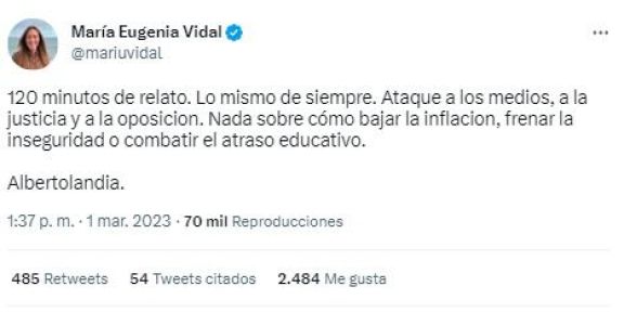 Además, María Eugenia Vidal de Juntos por el Cambio, ironizó en sus redes: "120 minutos de relato. Lo mismo de siempre. Ataque a los medios, a la justicia y a la oposición. Nada sobre cómo bajar la inflación, frenar la inseguridad o combatir el atraso educativo. Albertolandia".