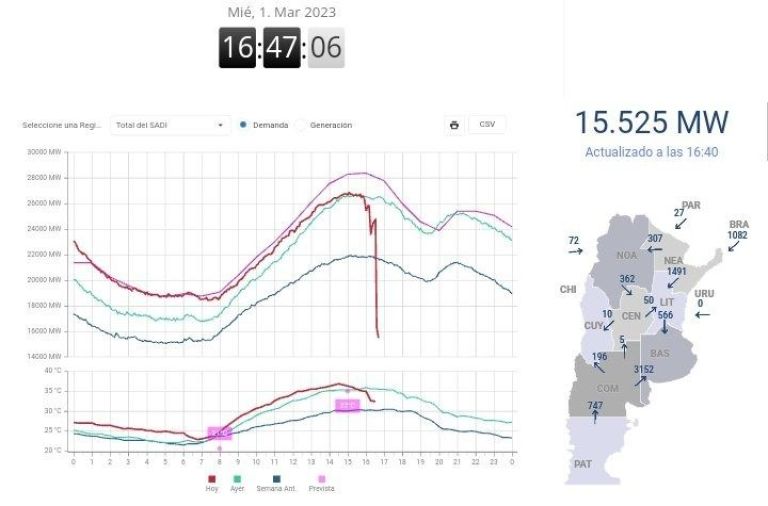 Según reportó La Nación, el "masivo corte de luz" se produjo por problemas de funcionamiento en la central nuclear Atucha I, esto generó un apagón que afecta a una parte importante del AMBA, San Luis, San Juan, Córdoba, Santa Fe, La Pampa, Tucumán, Mendoza.