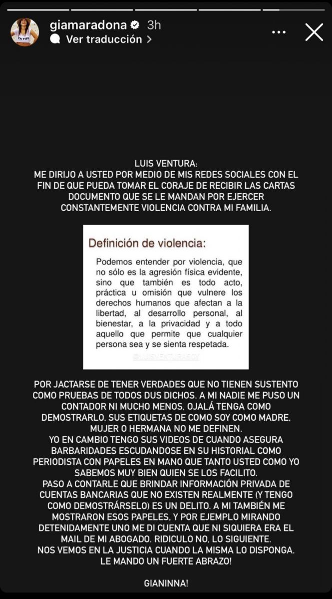 Gianinna Maradona decidió ponerle un freno a los dichos del periodista Luis Ventura acerca de ella y su familia y decidió poner la situación en manos de la justicia. “Por ejercer constantemente violencia hacia mi familia”, sostuvo.