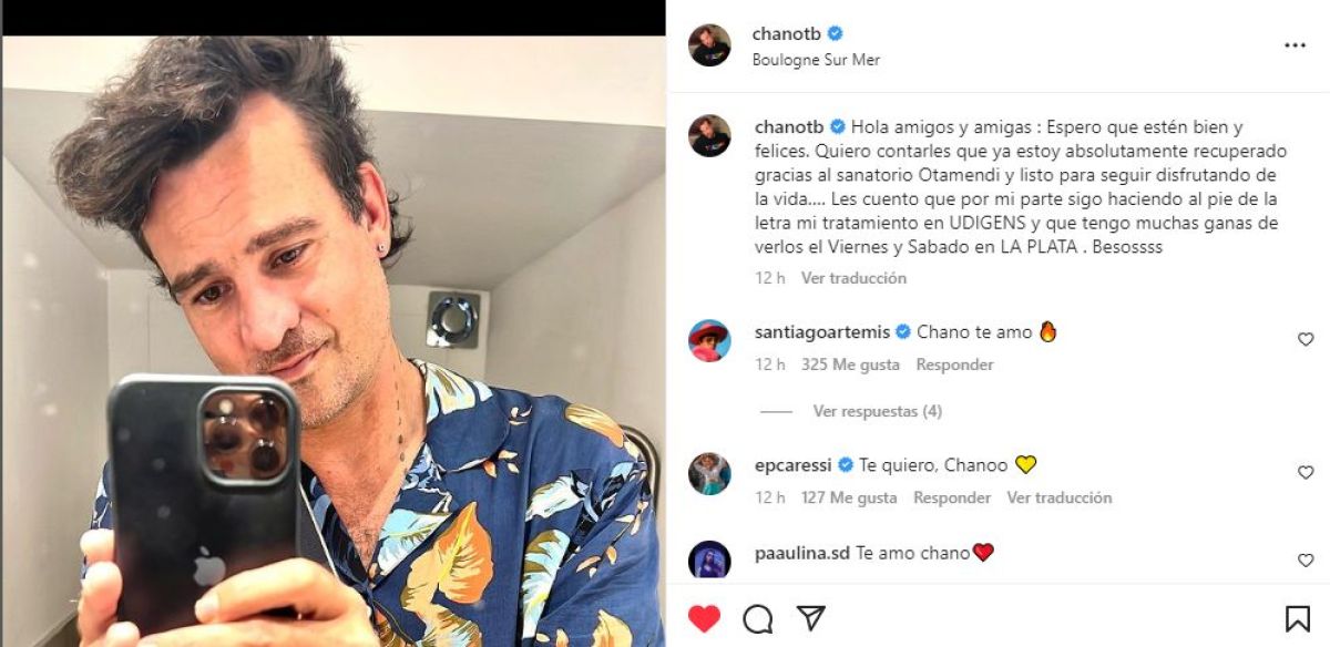“Hola amigos y amigas: Espero que estén bien y felices. Quiero contarles que ya estoy absolutamente recuperado gracias al sanatorio Otamendi y listo para seguir disfrutando de la vida”, escribió a través de un posteo de Instagram.