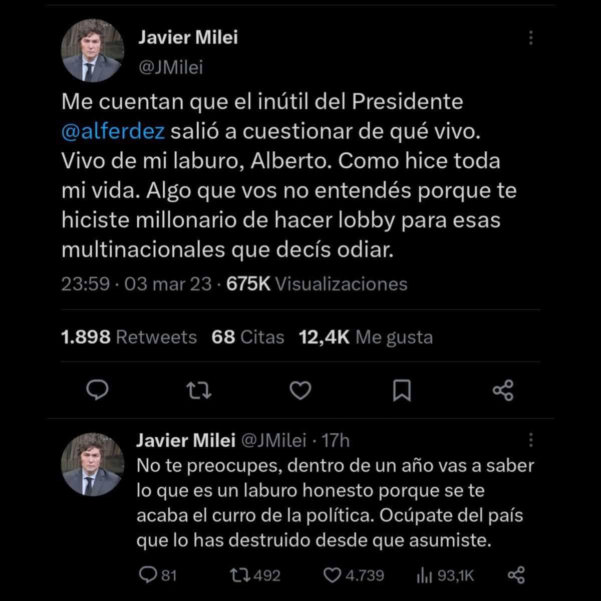 Desde la red social del pájarito, Milei lanzó: "Me cuentan que el inútil del Presidente Alberto Fernández salió a cuestionar de qué vivo. Vivo de mi laburo, Alberto. Como hice toda mi vida. Algo que vos no entendés porque te hiciste millonario de hacer lobby para esas multinacionales que decís odiar".