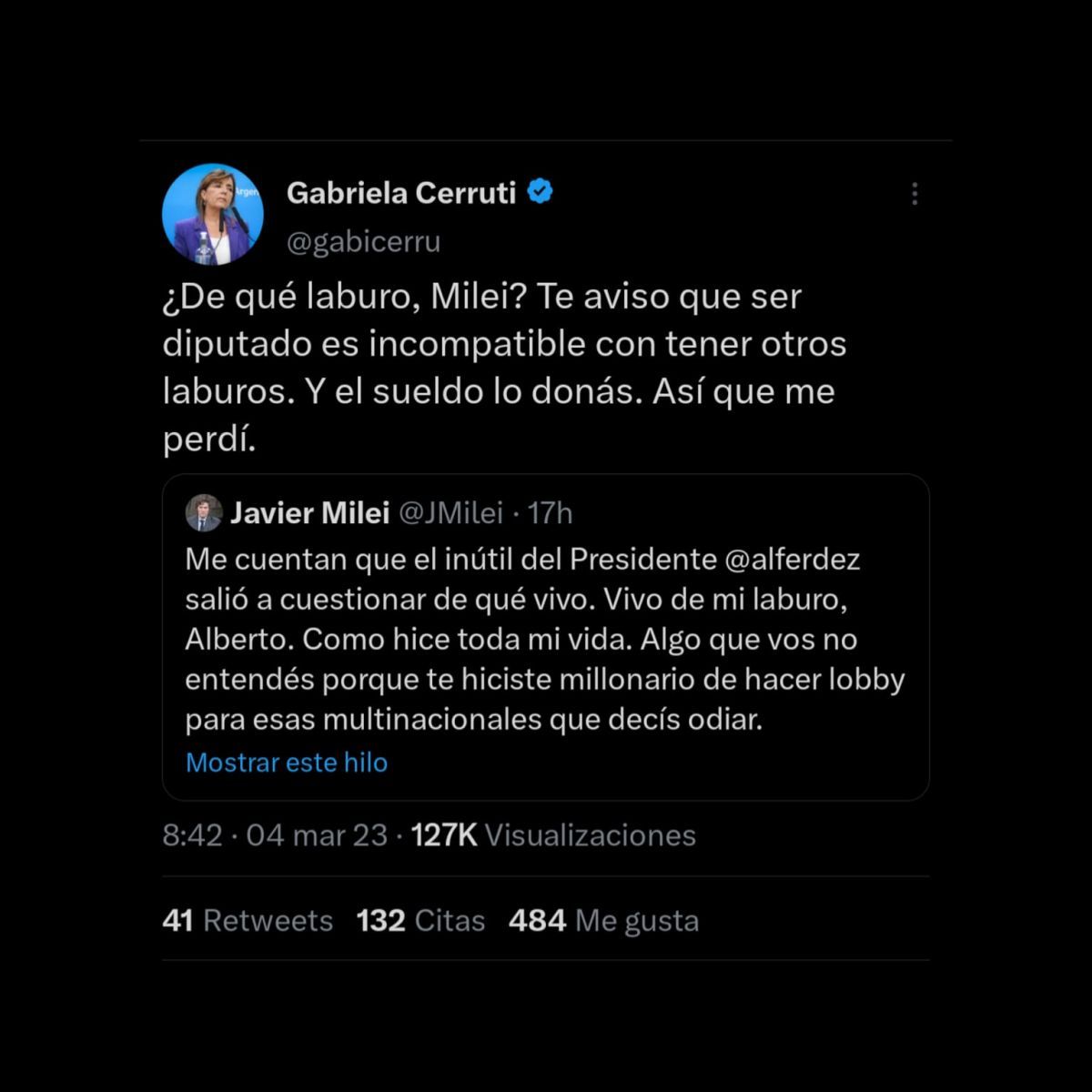 "No te preocupes, dentro de un año vas a saber lo que es un laburo honesto porque se te acaba el curro de la política. Ocúpate del país que lo has destruido desde que asumiste", señaló el funcionario. Y Cerruti le respondió: "¿De qué laburó, Milei? Te aviso que ser diputado es incompatible con tener otros laburos. Y el sueldo lo donás. Así que me perdí".