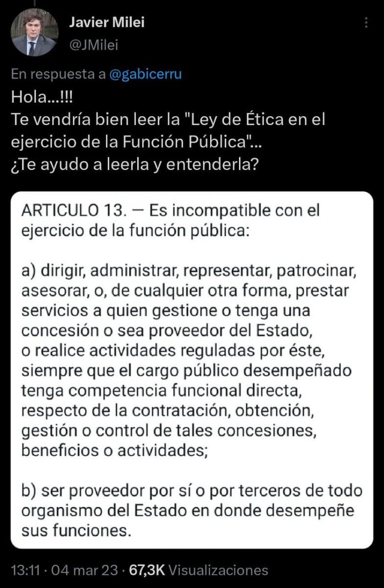 Por último, el económista añadió: "¡Hola! Te vendría bien leer la "Ley de Ética en el ejercicio de la Función Pública"... ¿Te ayudo a leerla y entenderla?". Luego la vocera presidencial, le contestó: "La conozco de memoria. La de la ciudad la hice yo. Contame que la empresa que te financia no está regulada por el estado ahora".