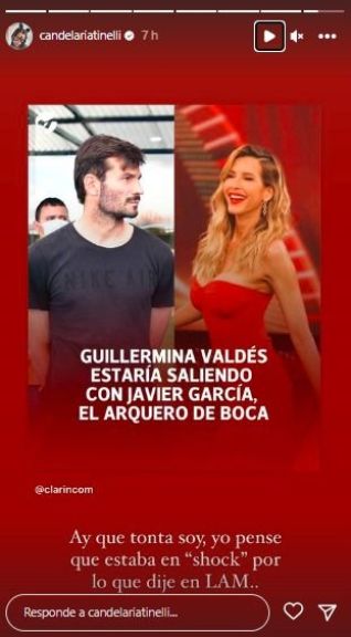 La hija de Tinelli reaccionó picante a la primicia de LAM sobre el romance que tendría la ex de su padre con el jugador de Boca Juniors, Javier García. La modelo reposteó en su Instagram la publicación de Clarín, y escribió: "Ay, que tonta soy. Yo pensé que estaba en shock por lo que dije en LAM".