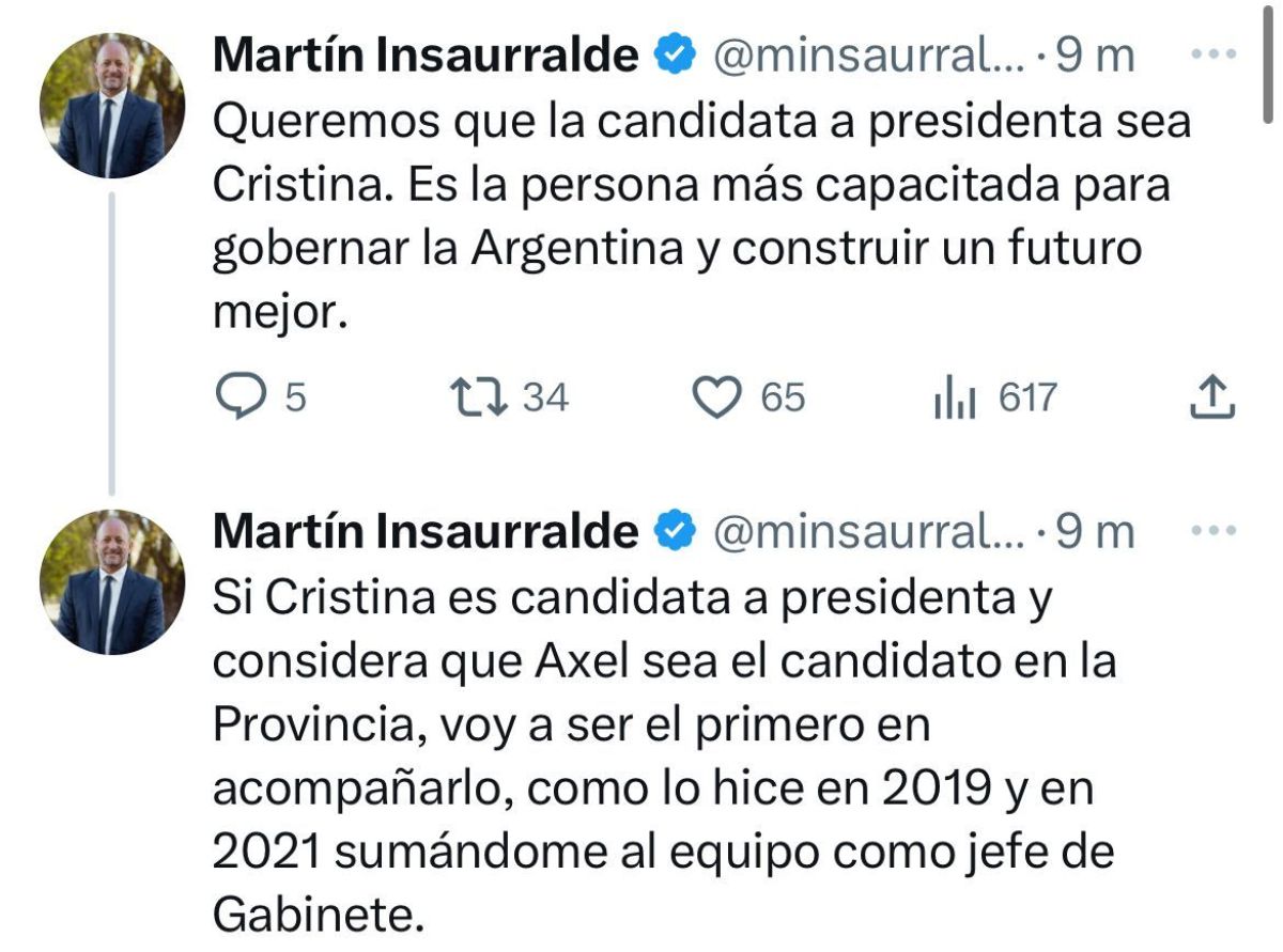 El jefe de Gabinete de la Provincia de Buenos Aires, Martín Insaurralde se expresó en sus redes sociales y fue contundente con el mensaje: “Queremos que la candidata a presidenta sea Cristina”.