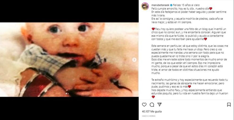 En su cuenta de Instagram, Maru comenzó: "Felices 15 años al cielo. Feliz cumple amorcito, hoy es tu día , nuestro día. En este día festejamos el poder haber seguido y poder sentirme más liviana. Era así la consigna, y aquella mochila de piedras, cada año se lleva mejor, y estás en mi siempre".