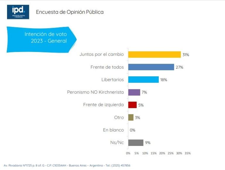 En las intenciones de voto también aparecieron como posibles candidatos Axel Kicillof y Sergio Massa. El Frente de Todos obtuvo el segundo puesto en las intenciones de voto con un 27%.